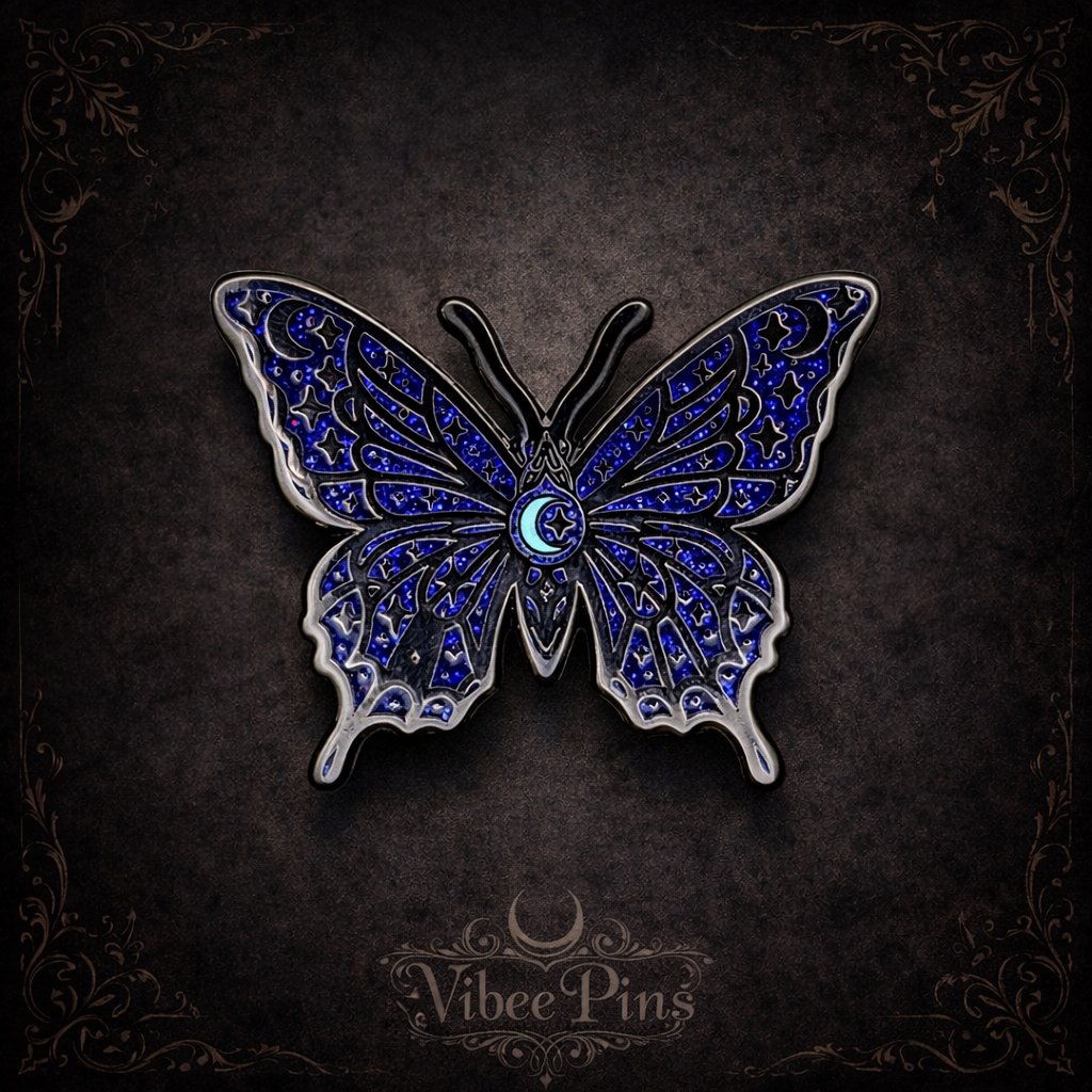 Reach for the stars with this enchanting celestial butterfly hard enamel pin. Featuring glow-in-the-dark moon detail and galaxy-glitter wings, this collectible celebrates transformation, cosmic beauty, and dark mysticism, perfect for celestial enthusiasts and collectors.